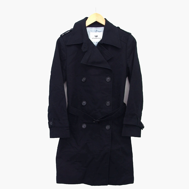 【中古】ビバユー VIVA YOU トレンチ コート ミドル丈 ストライプ 柄 ベルト スリット 袖ベルト コットン 綿 2