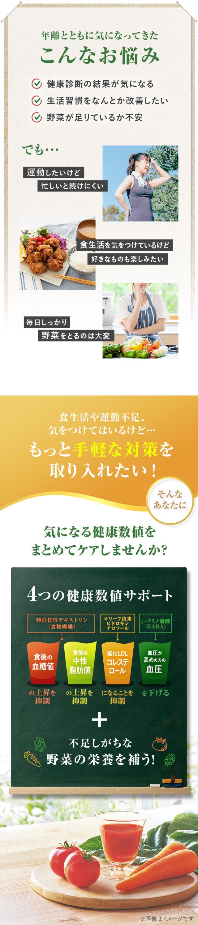 4つの健康数値(食後の血糖値、食後の中性脂肪値、酸化LDLコレステロール、高めの血圧)をサポートする日本初の機能性表示食品の野菜飲料が誕生。