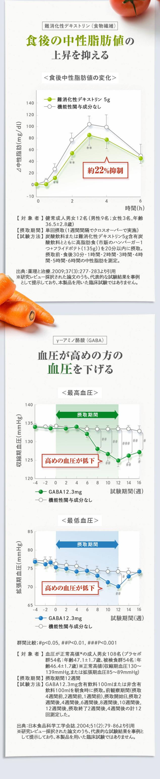 本品には難消化性デキストリン(食物繊維)、オリーブ由来ヒドロキシチロソール及びγ-アミノ酪酸(GABA)が含まれます。難消化性デキストリン(食物繊維)は、食事から摂取した糖や脂肪の吸収を抑えるので、食後の血糖値や血中中性脂肪値の上昇を抑制することが報告されています。オリーブ由来ヒドロキシチロソールは抗酸化作用を持ち、血中のLDLコレステロール(悪玉コレステロール)が酸化され、酸化LDLコレステロールになることを抑制することが報告されています。γ-アミノ酪酸(GABA)は血圧が高めの方の血圧を下げることが報告されています。