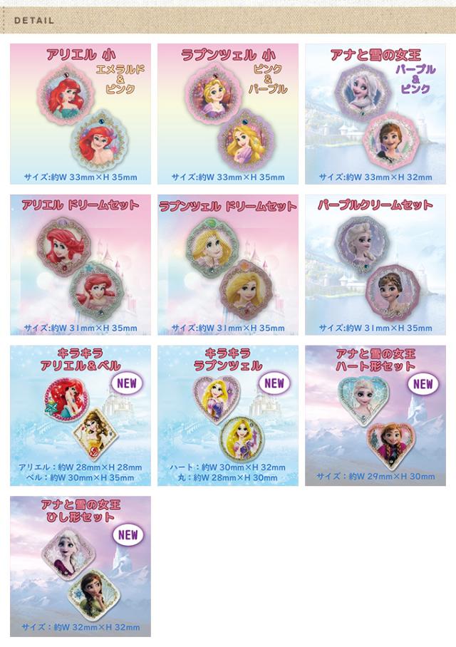 【エメラルド&ピンク】 約W 33mm×H 35mm 【ピンク&パープル】 約W 33mm×H 35mm 【パープル&ピンク】 約W 33mm×H 32mm 【アリエル ドリームセット】 約W 31mm×H 35mm 【ラプンツェル ドリームセット】 約W 31mm×H 35mm 【パープルクリームセット】 約W 31mm×H 35mm 【キラキラ アリエル&ベル】 アリエル:約W 28mm×H 28mm ベル:約W 30mm×H 35mm 【キラキラ ラプンツェル】 ハート:約W 30mm×H 32mm 丸:約W 28mm×H 30mm 【アナと雪の女王 ハート形セット】約W 29mm×H 30mm 【アナと雪の女王 ひし形セット】約W 32mm×H 32mm |