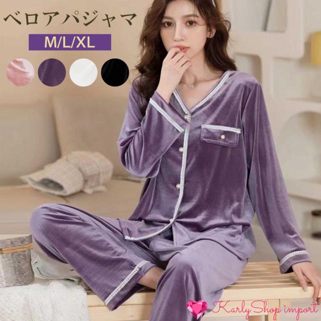 KarlyShop import ルームウェア パジャマ ベロア ベルベット ナイトウェア 長袖 上下セット 前開き 光沢 姫系 春 秋 冬 pjm970