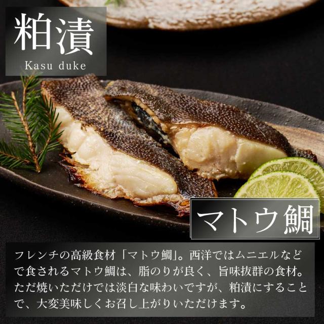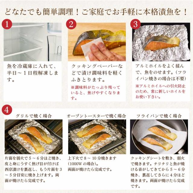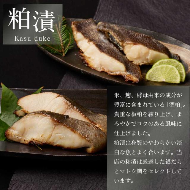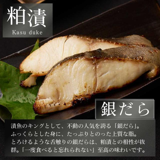 | 内容量 | 5種類×各2切(合計10切) 1. 銀だら 粕漬 1切×2パック 2. マトウ鯛 粕漬 1切×2パック 3. 秋鮭 西京味噌漬 1切×2パック 4. 縞ホッケ 味噌漬 1切×2パック 5. ブリ 照り焼き 1切×2パック ※各パック約70g |