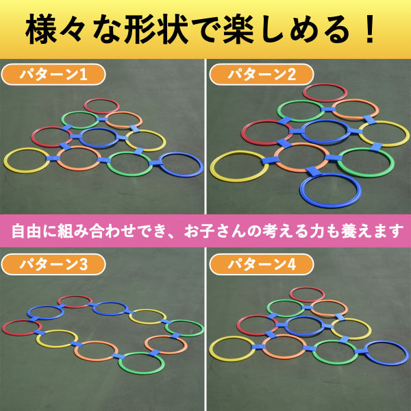 ジョイントパーツを使うことでカラフルでかわいいリングを自由に組み合わせて自在なパターンを作ることが可能です。自在な組み合わせが可能でお子様の考える力を養えます。