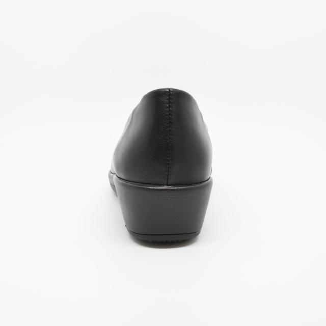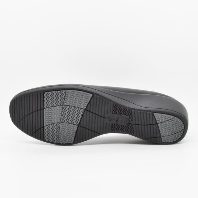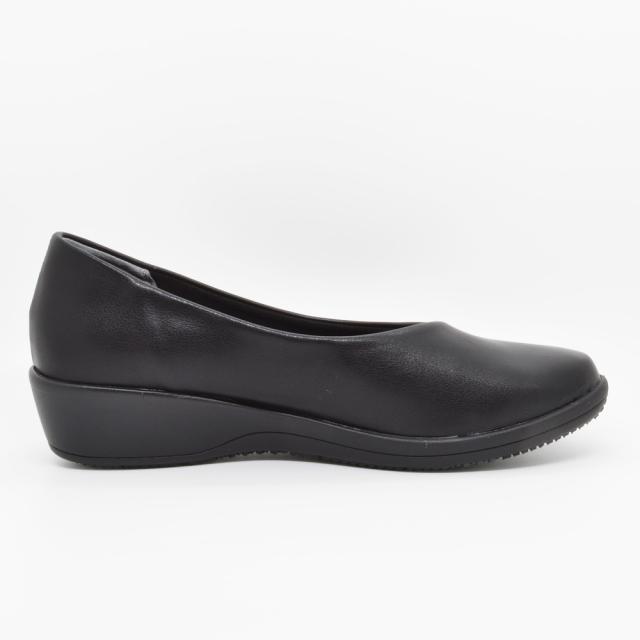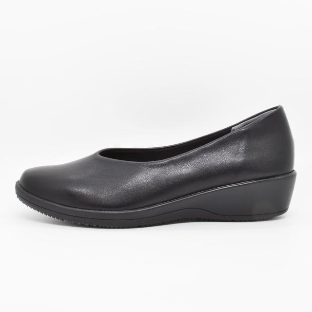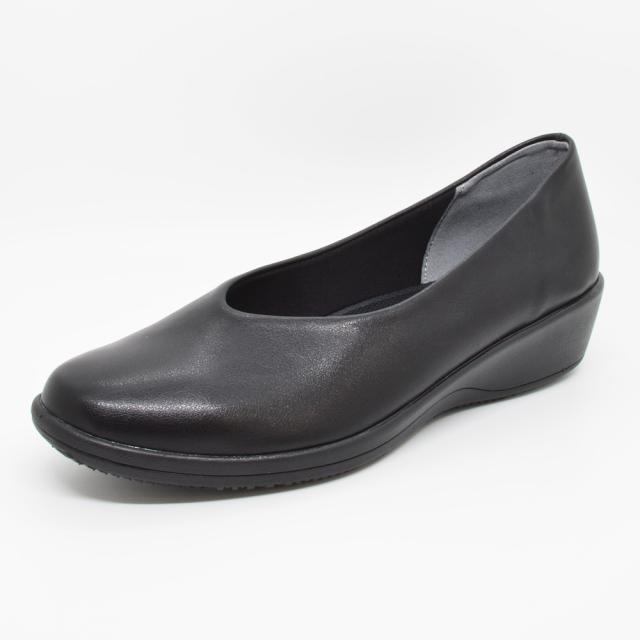 Vカットデザインでスッキリとした足元を演出。伸縮性のあるストレッチ合皮が足に優しくフィットする軽量オフィスパンプス。