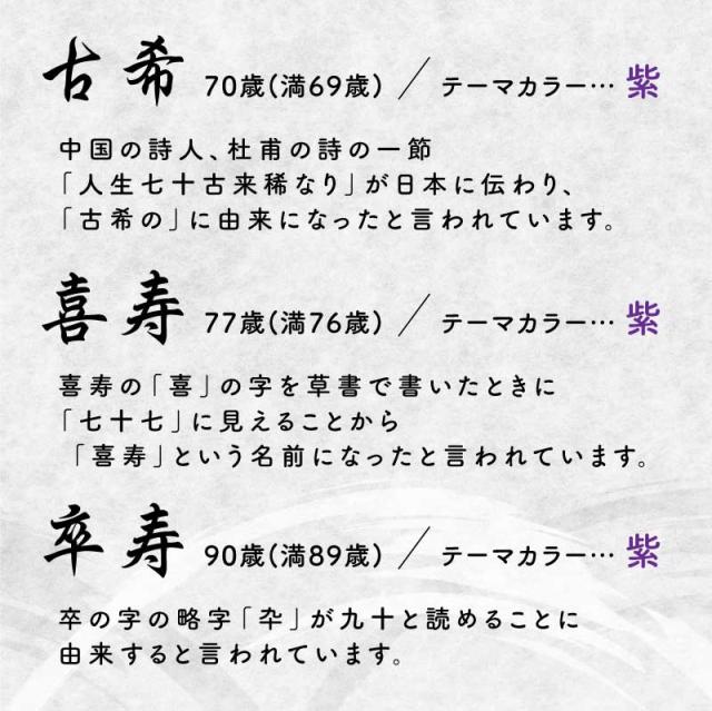 | “紫色”は、日本古来より「高貴な色」として使用されてきました。 贈る相手に対する敬意を表す色として有名です。 この紫色を使用する長寿のお祝いは3つあります。 ・古希:70歳(満69歳) ※現代では満70歳に祝うのが一般的です 唐の詩人である杜甫の「人生七十古希稀なり」という詩の一節に由来するといわれています。”古”が「古来」、”希”は「めったにない、まれ」という意味で「古来より70歳まで生きる人は稀である」ということから、長寿の節目として祝うようになりました。 ・喜寿;77歳(満76歳) ※現代では満77歳に祝うのが一般的です 還暦や古希とは異なり、日本で生まれたといわれている習わしです。喜寿の「喜」の字を草書で書いたときに「七十七」に見えることから、「喜寿」という名前になったと言われています。 ・卒寿:90歳(満89歳) ※現代では満90歳に祝うのが一般的です こちらも、日本発祥のお祝いといわれています。「卒」の略字「卆」が九十に見えることから、その名がつけられたそうです。また、鳩に「九」がつくことや、音読みが「きゅう」であることから「鳩寿(きゅうじゅ)」とも呼ばれています。テーマカラーは白or紫です。 節目を迎えた大事な”あの人”へ、かわいいプレゼントを贈りませんか? 当店が考えた現代の長寿のお祝いにふさわしい”ご長寿ベア”を、2つのおすすめポイントと共にご紹介します♪ 1、見た目もかわいい!ちゃんちゃんこベア 紫色のちゃんちゃんこ、帽子をかぶり、紫色の座布団に座ったクマちゃん。クマちゃんは当店のギフトにたびたび登場している子ですが、ちゃんちゃんこや帽子、座布団は、既製品ではなく、当店の完全オリジナルなんです! 既製品ではどうしてもしっくりこず…”じゃあ作るか!”ということで試作を繰り返した末に完成しました。 見事にフィットしている帽子は、大きめだからかわいいんです♪ちゃんちゃんこも帽子も着脱可能なので、これなら、自分がちゃんちゃんこを着ることに抵抗のある方も喜んでくれるはずですっ! さらに”ぬいぐるみテラピー”という言葉もあるように、このクマちゃんをなでることで、癒し効果も◎触り心地抜群の毛並みにうっとりすること請け合いですよ♪ 飾ったままでも、抱っこしてもかわいいクマちゃんに癒されながら元気に長生きしてほしい。そんな思いで作っています♪ 2、当店特製木札にメッセージとお名前を入れて贈れます♪ こちらのクマちゃんとセットで、贈る相手のお名前と、メッセージをプリントした木の立札をお付けします。 〔 メッセージ7種類 〕 特別なギフトシーンにぴったりなメッセージが7種類。相手の事を想いながらお選びください♪ ・ 古希祝 ・ 喜寿祝 ・ 卒寿祝 ・ 誕生祝 ・ 感謝してます ・ いつもありがとう ・ ずーっと元気でいてね 〔 名入れプリント 〕 名入れギフト専門店の当店にて、気持ちを込めてお名前をプリントいたします。 「 どうして名前入りが喜ばれるの? 」 生まれた時からずっと一緒に生きてきた「名前」。普段あまりにも身近にあるので、自分の名前のことを深く考える機会はありませんが贈られた商品に自分の名前が刻まれていたらいかがでしょう。その瞬間、“プレゼント”は“自分だけの大切なもの”へと変化します。そして贈ってくれた方の真心を感じ、自然に笑顔がこぼれるのではないでしょうか。 名前はその人にとって唯一無二、かけがえのないものです。私たちはそのお名前を大切に、贈る人、贈られる人、両方の笑顔を想いながら商品を送り出しています。当店のお名前彫刻は専門のスタッフがこだわりと自信をもって行っていますので、1文字1文字つぶれることなく鮮明に刻印され、ずっと消えずに残ります。 お客様の気持ちのこもったギフトを永く愛着を持ってお使いいただけますように。 それが、私たち名入れギフトOkuluスタッフ全員の願いです。 ≪こんなシーンにおすすめ≫ ・ 古希祝い 喜寿祝い 卒寿祝い の 贈り物 として ・ 母の日 父の日 での贈り物に ・ お父さん お母さん 父 母 へのプレゼントに ・ おじいちゃん おばあちゃん 祖父 祖母 への 長寿祝い に ・ 敬老の日 の贈り物に |