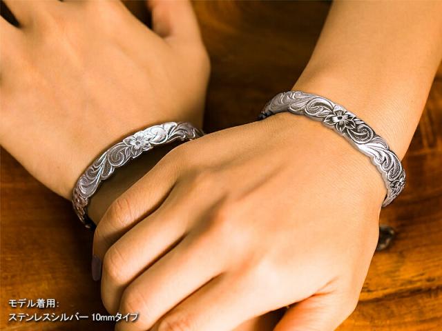 ハワイアンジュエリー ペアバングル ステンレス サージカルステンレス バングル 刻印無料 プルメリア スクロール シルバーカラー メンズ レディース ハワイアン