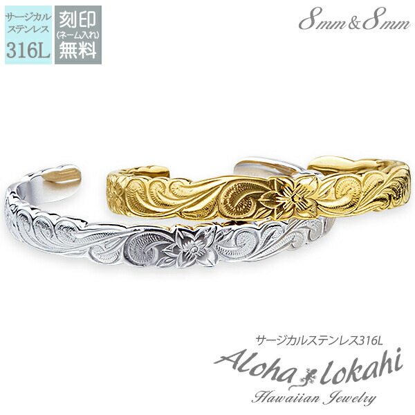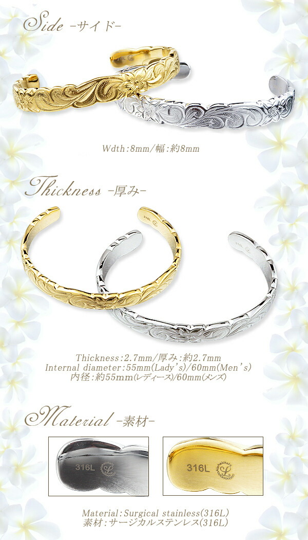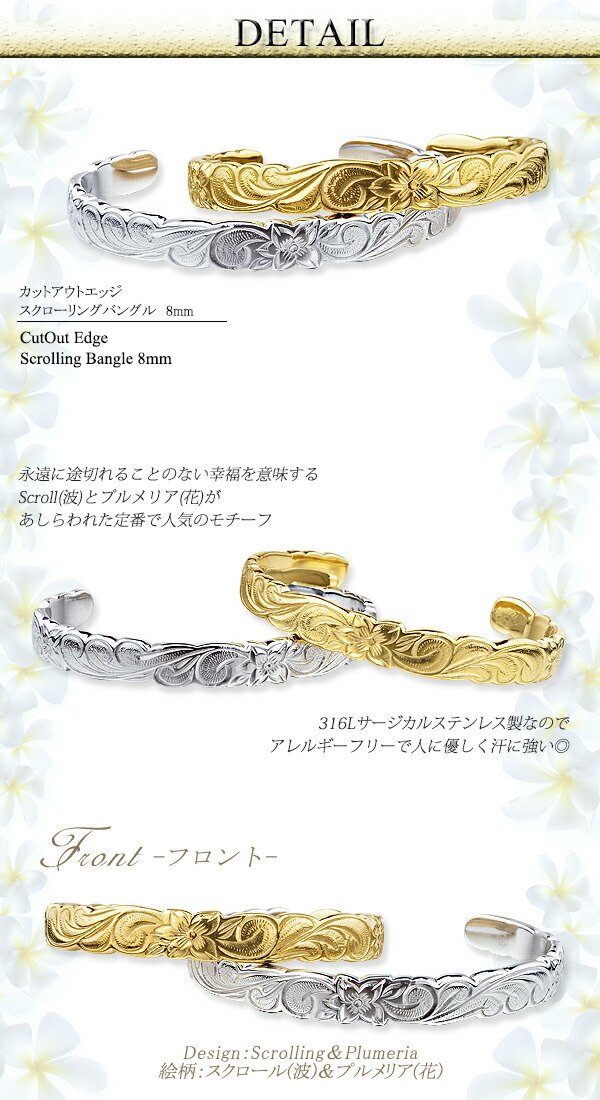| 商品名 | ハワイアンジュエリー ハワイアン ペアバングル ステンレス サージカルステンレス 刻印無料 プルメリア スクロール |