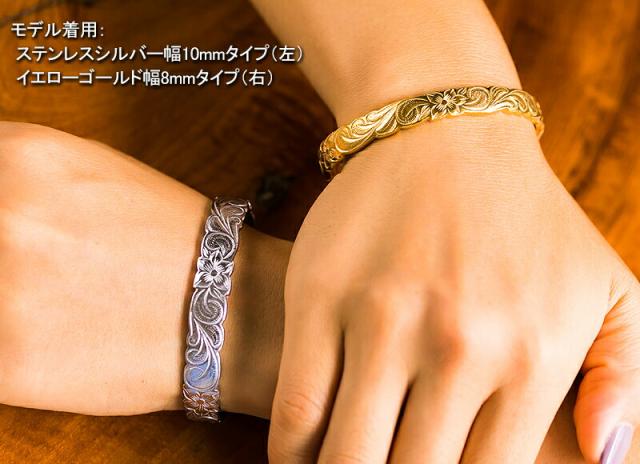 ハワイアンジュエリー ペアバングル ステンレス サージカルステンレス バングル 刻印無料 プルメリア スクロール シルバーカラー イエローゴールド メンズ レディース ハワイアン