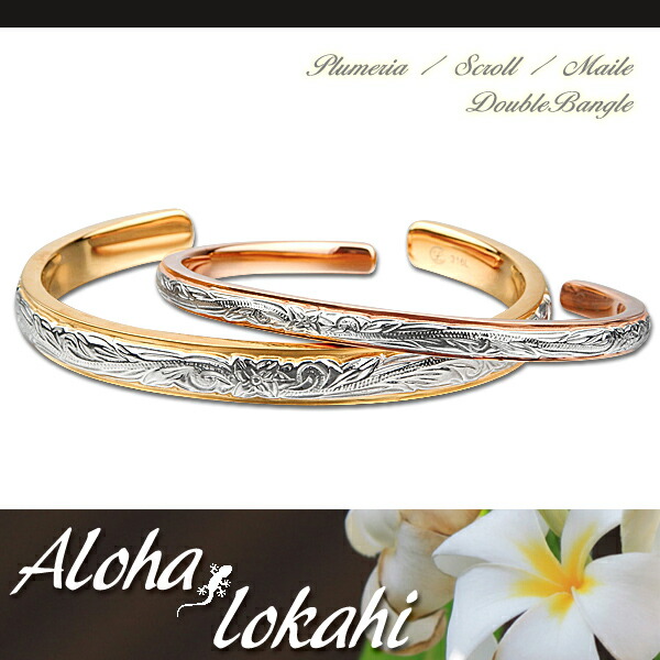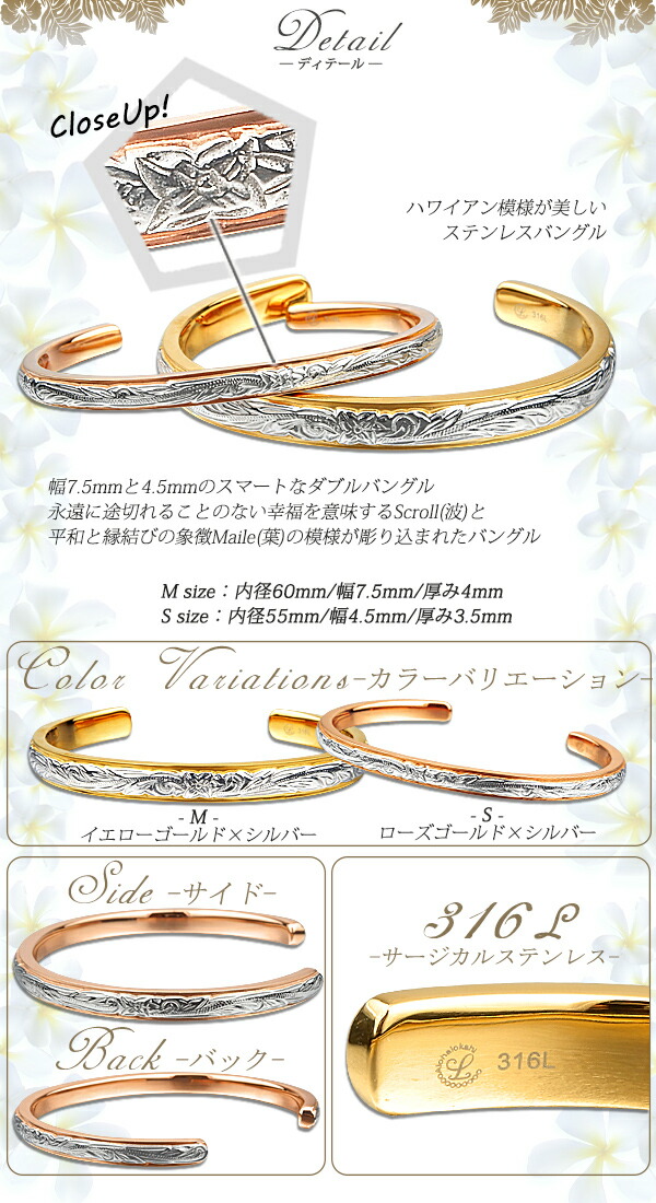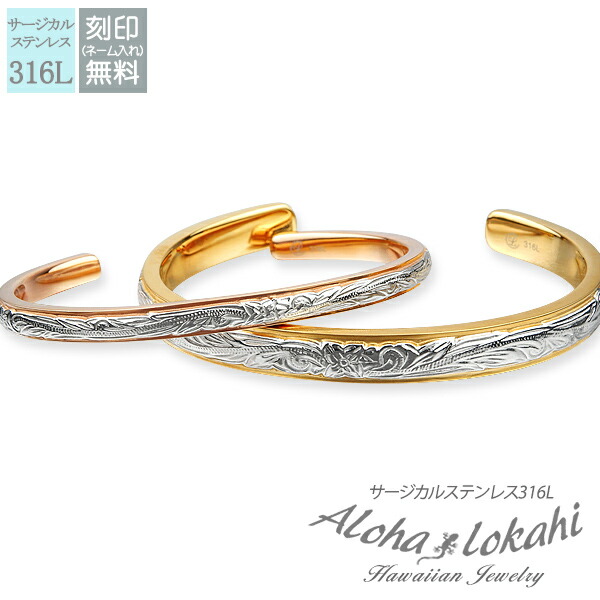 ハワイアンジュエリー ペアバングル ペアブレスレット ステンレス 刻印無料 つけっぱなし サージカルステンレス 金属アレルギー対応 バングル メンズ レディース プルメリア スクロール ローズゴールド イエロー ハワイアン プレゼント 2本セット ケース付 記念日 クリスマス