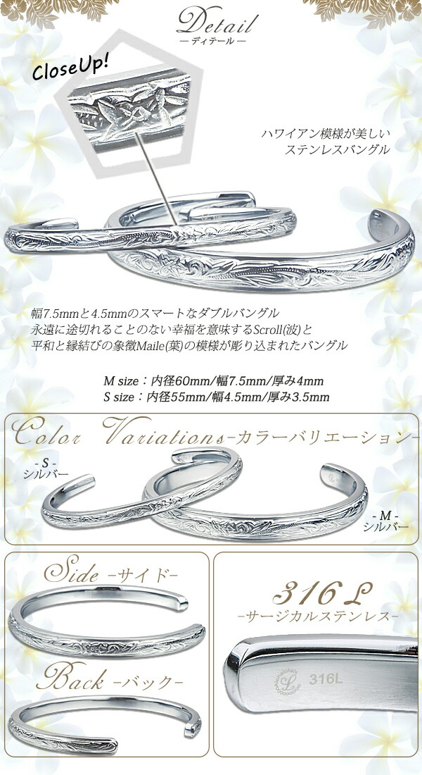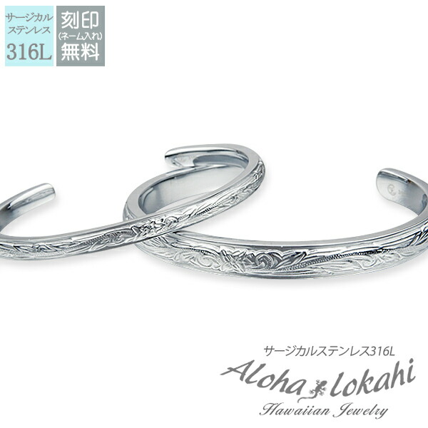 | 商品名 | ハワイアンジュエリー ハワイアン ペアバングル ステンレス サージカルステンレス 刻印無料 プルメリア スクロール メンズ レディース |