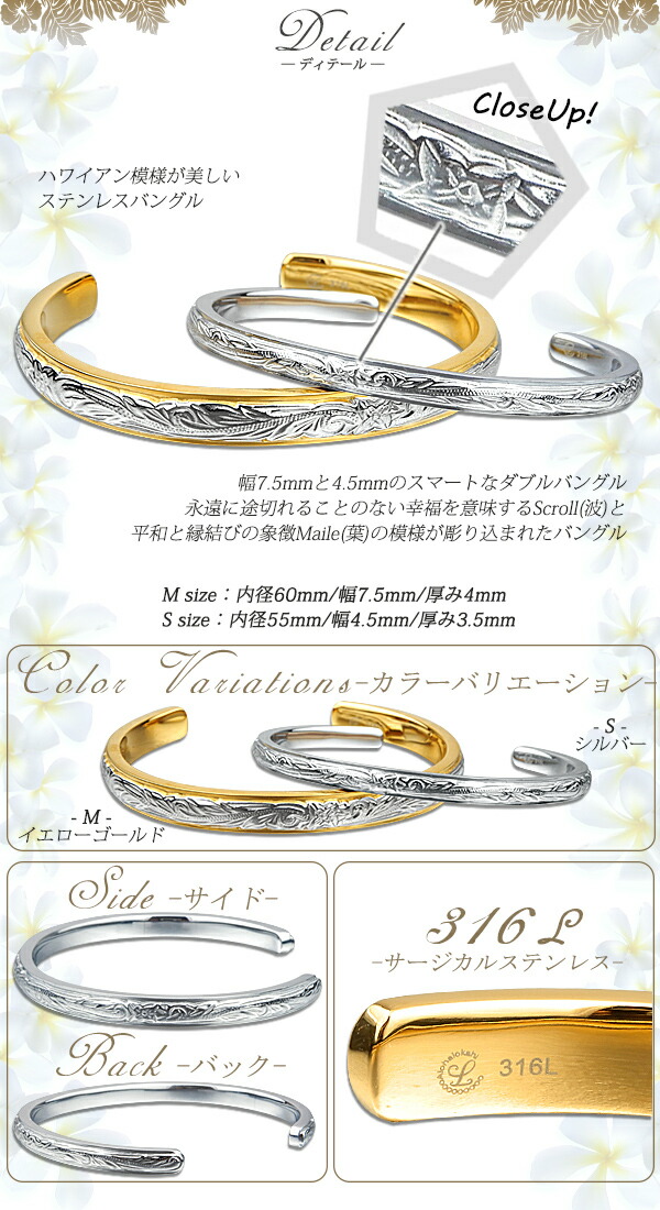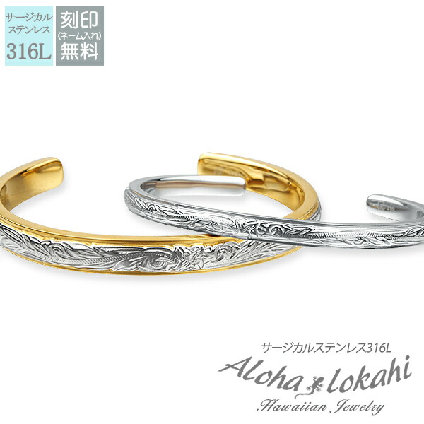 | 商品名 | ハワイアンジュエリー ハワイアン ペアバングル ステンレス サージカルステンレス 刻印無料 プルメリア スクロール メンズ レディース |