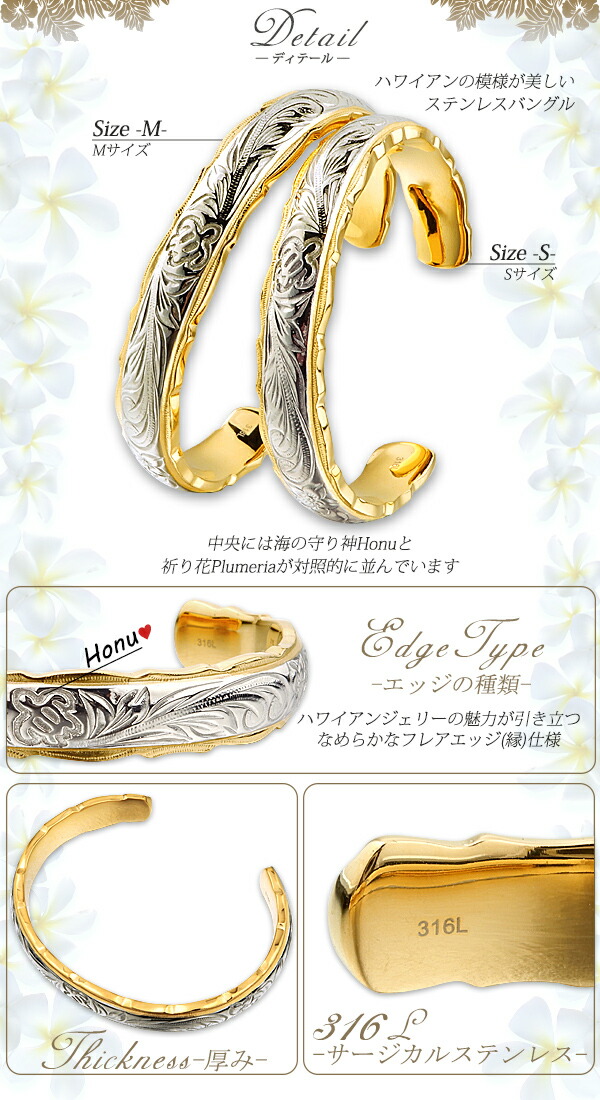 | 商品名 | ハワイアンジュエリー ハワイアン ペアバングル ステンレス サージカルステンレス 刻印無料 ホヌ プルメリア スクロール |