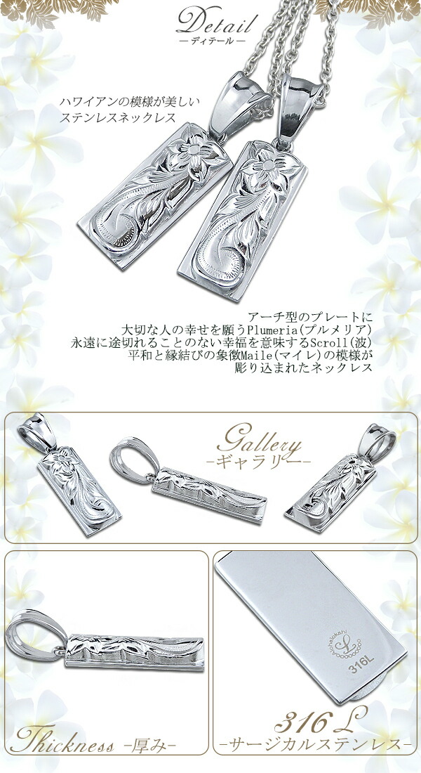 | 商品名 | ハワイアンジュエリー ハワイアン ペアネックレス ステンレス サージカルステンレス ネックレス 刻印無料 ダブルプレート スクロール あずきチェーン付き |