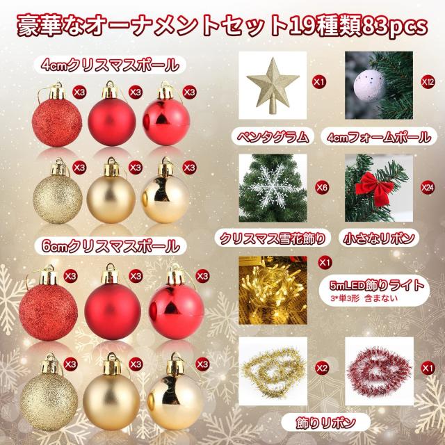 【豊富な装飾品】ツリーには83 pcsの装飾品が付属しており、想像力を発揮してご家族やお友達と一緒に素敵なクリスマスツリーを作ることができます。金、赤、白の装飾と緑のクリスマスツリーは、美しいクリスマスの雰囲気を与える。
