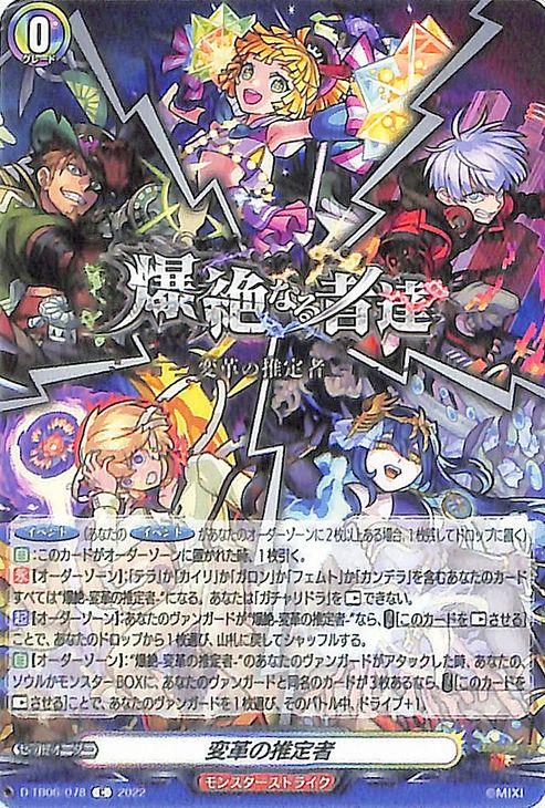【自】【オーダーゾーン】:“爆絶-変革の推定者-”のあなたのヴァンガードがアタックした時、あなたの、ソウルかモンスターBOXに、あなたのヴァンガードと同名のカードが3枚あるなら、【コスト】[このカードを【レスト】させる]ことで、あなたのヴァンガードを1枚選び、そのバトル中、ドライブ+1。