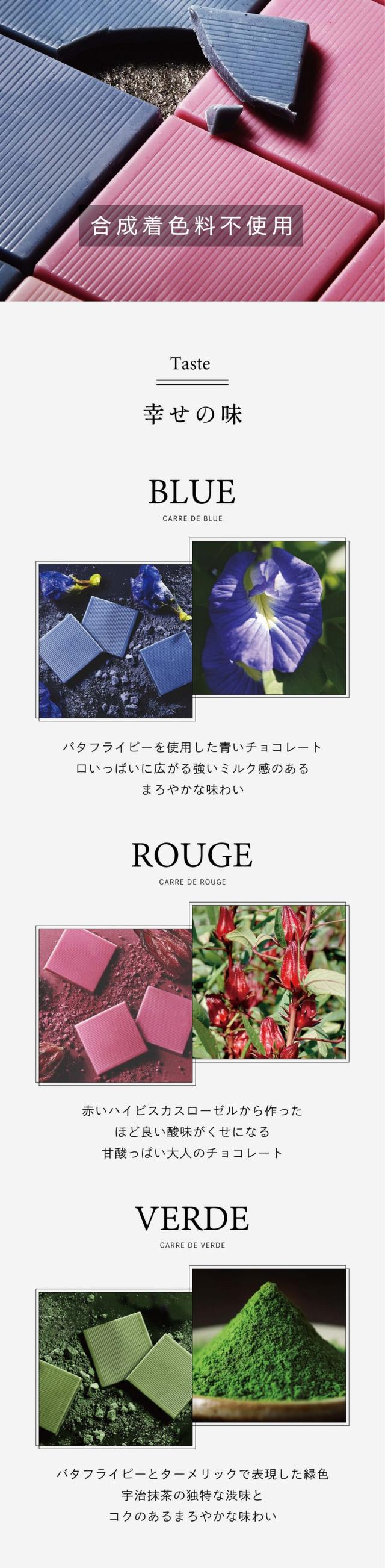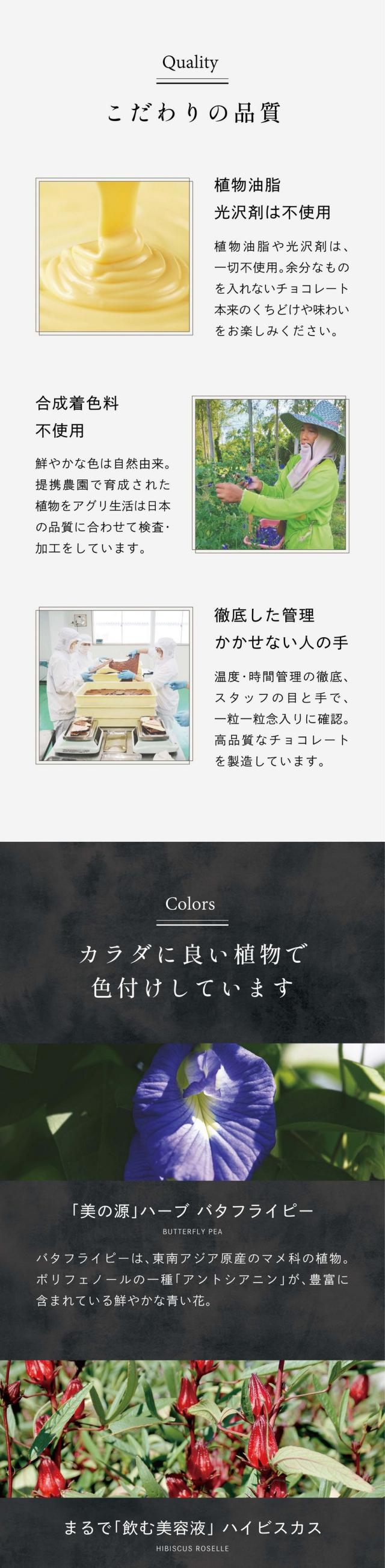 原材料名 【ブルー】チョコレート(国内製造(砂糖、ココアバター、全粉乳、脱脂粉乳))/着色料(バタフライピーパウダー)、乳化剤、香料、(一部に乳成分・大豆を含む)【ルージュ】チョコレート(国内製造(ココアバター、砂糖、乳糖、バターミルクパウダー))、ハイビスカスパウダー/野菜色素、酸味料、乳化剤、(一部に乳成分・大豆を含む)【ヴェルデ】チョコレート(国内製造(砂糖、ココアバター、全粉乳、脱脂粉乳))、抹茶/着色料(バタフライピーパウダー、ウコンパウダー)、香料、乳化剤、(一部に乳成分・大豆を含む)【リラ】チョコレート(国内製造(ココアバター、砂糖、乳糖、バターミルクパウダー))、ハイビスカスパウダー/野菜色素、着色料(バタフライピーパウダー)、乳化剤、香料、(一部に乳成分・大豆を含む)【ホワイト】チョコレート(国内製造(ココアバター、砂糖、乳糖、バターミルクパウダー))/乳化剤、(一部に乳成分・大豆を含む)