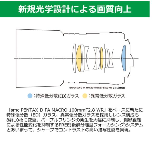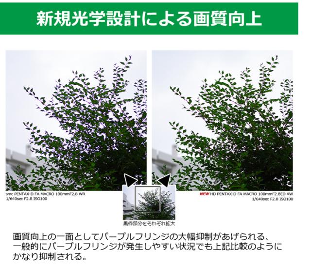 レンズ先端から被写体まで13cmの距離で等倍の撮影が可能なマクロレンズ。新たに特殊分散(ED)ガラス、異常低分散ガラスを採用した新設計の光学系により、パープルフリンジの発生を抑制。