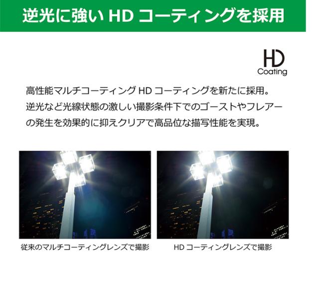 独自の高性能マルチコーティング「HDコーティング」を採用しています。従来のマルチコーティングに比べ、より反射が少なく透過率が高いので、逆光など光線状態の厳しい撮影条件下でゴーストやフレアーの発生を抑え、クリアな描写を実現しています。