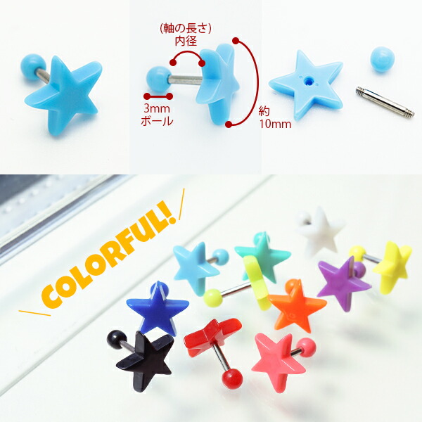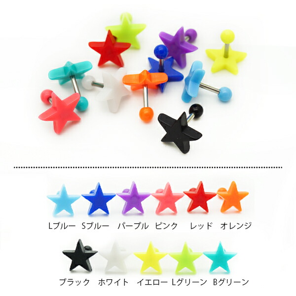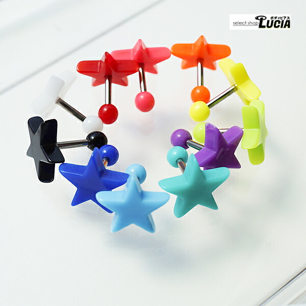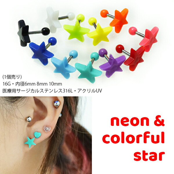 本日P2倍 16G ピアス ボディピアス スター 星 ストレートバーベル ネオンカラー 金属アレルギー対応 316L 高品質 ステンレス アクリル 軟骨ピアス 可愛い