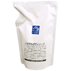 「松山油脂 M-mark いよかんボディソープ 480mL」は、植物オイル(パーム核油とべに花油)を釜で丹念に焚き上げてつくった、泡立ちの良い液体石けんをベースに、肌への刺激が穏やかなアミノ酸系洗浄成分を配合したボディソープです。
