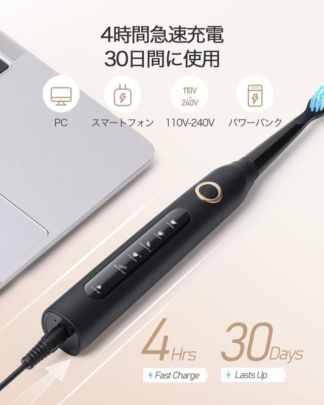 電動歯ブラシ 歯ブラシ 音波歯ブラシ 3つ替えブラシ ソニック 電動歯磨き IPX7防水 5モード USB充電 4時間がかかって