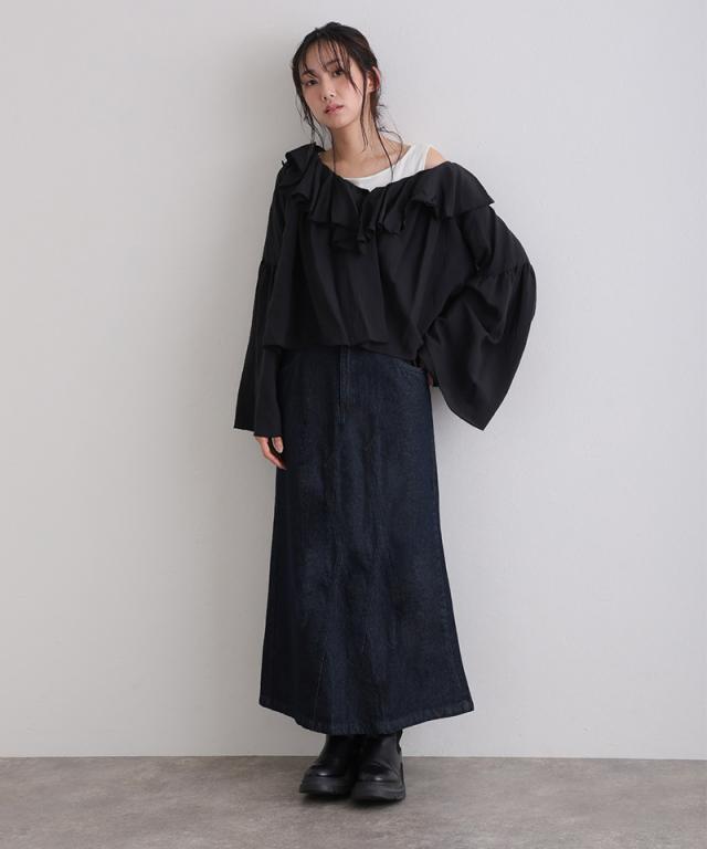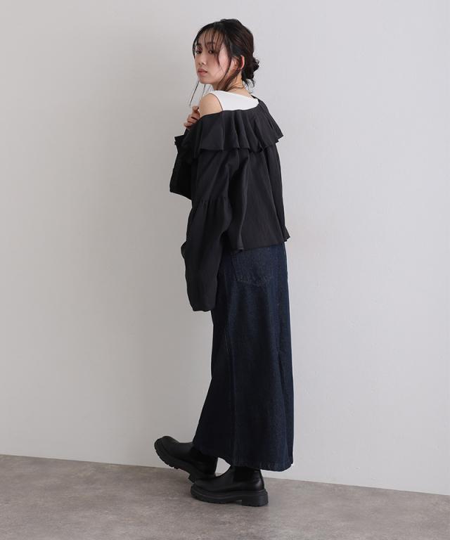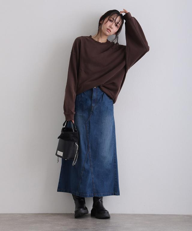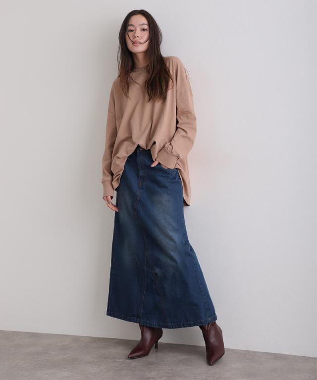 シルエットがきれいなデニムスカートなので、大人女性にぴったりです。