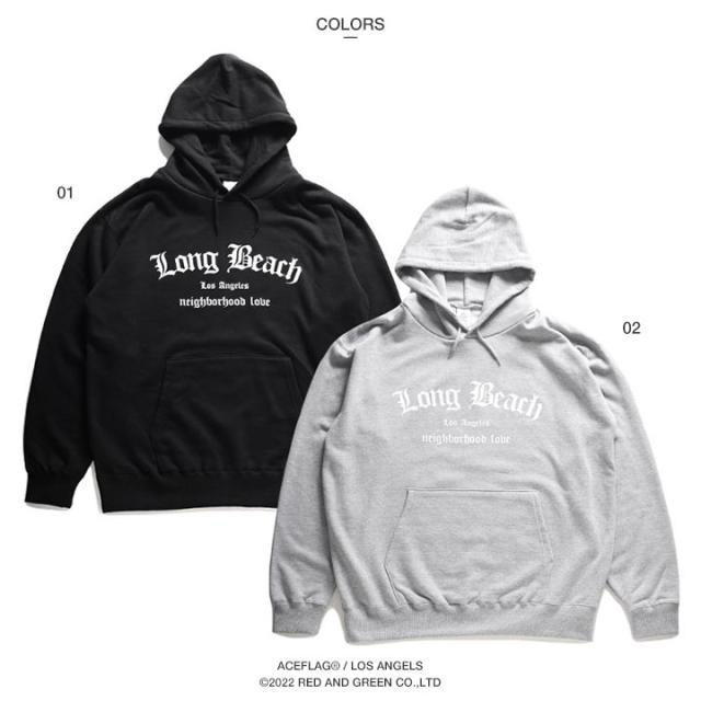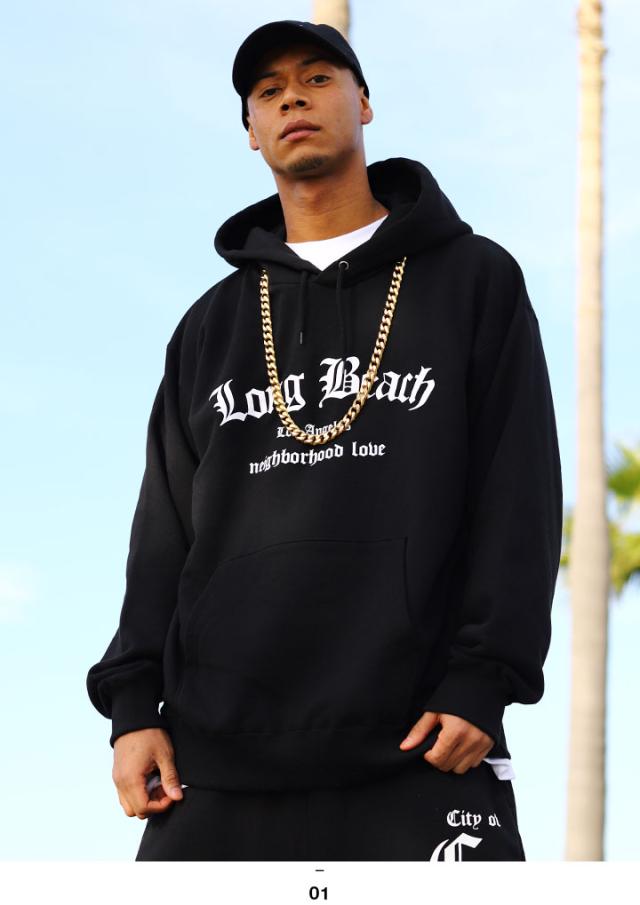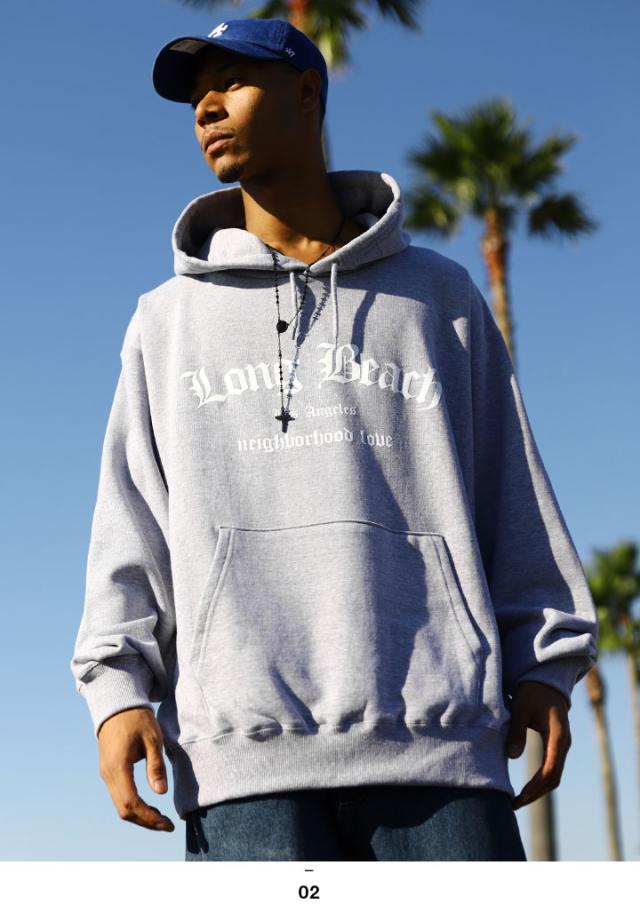 LBCの 略称で馴染み深い「Long Beach」をアーチロゴでドロップしたフードパーカー。