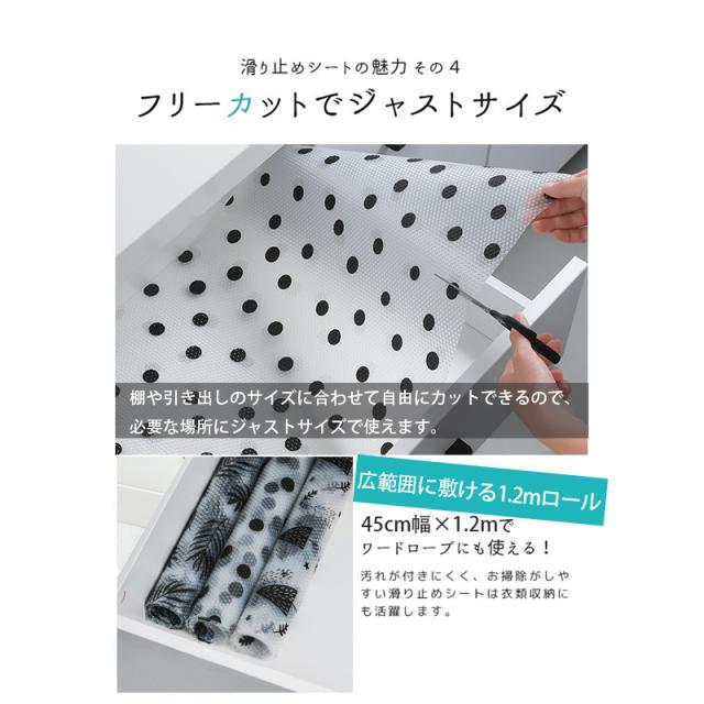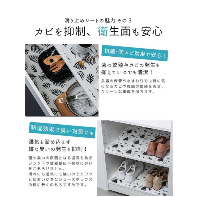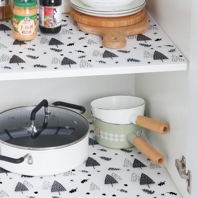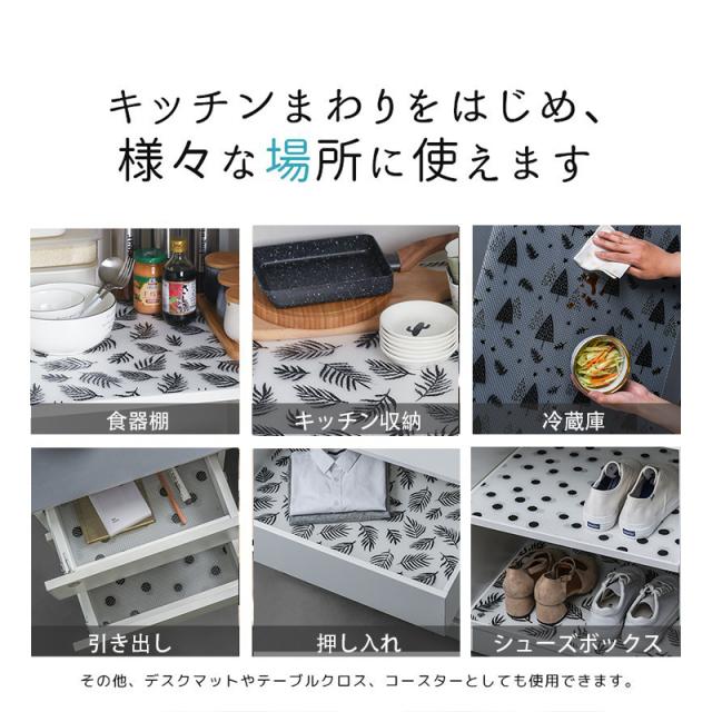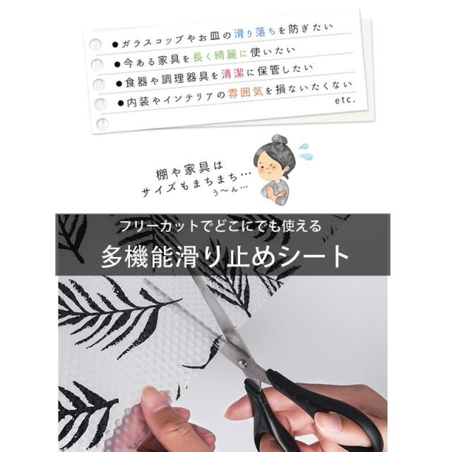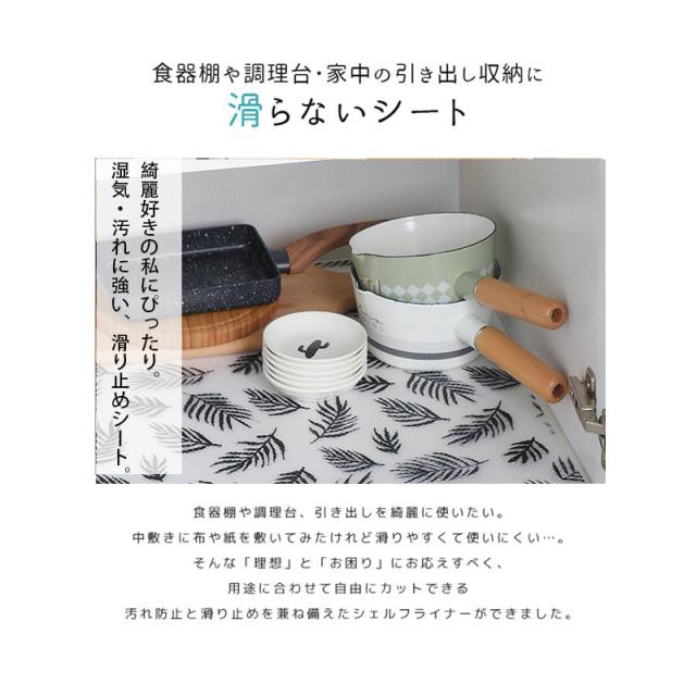 設置場所に合わせて好きなサイズにカットできるので、キッチンの食器棚や冷蔵庫はもちろん、押し入れ、下駄箱など、様々な場所で使えるシェルフライナーです。