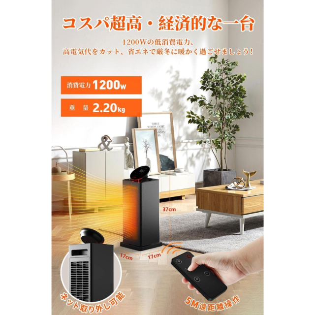 【細かく温度調節可能・消し忘れ防止のタイマー設定機能・無駄な電力消耗がない!】60度折り畳み可のLEDデジタルを上げると近くに置かなくても設定温度が見やすくなります。17〜37度まで温度を1度づつ細かく調整出来、MAX 1200Wの消費電力で稼働し、充実した暖房機能のまま、高い電気料金や無駄な電力消耗がない!1-24h設定可のタイマー設定機能が搭載され、寝る前やお出かけ前に切れタイマーを設定したりして、夜間と昼間の暖房を計画的に行い、朝起きや睡眠の際に最適温度を楽しみます。消し忘れの心配がなくなり、子供部屋にも安心してご利用いただけます。本省エネヒーターは室温の安定化が目的とする暖房にはピッタリ、今冬を快適に過ごせましょう!