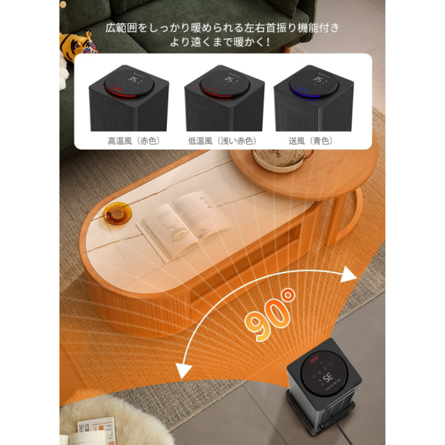 【足元まで全身を暖める大範囲送風ヒーター・左右90°自動首振り】本ヒーターは左右90度自動首振りし、いろんな角度まで温風を届きます。厳冬にエアコンから吹き出した温風が足元まで届かず、足元の冷えに悩んでいる場合、本速攻ヒーターで顔、手、背、お腹、腰、膝、足元まで暖風を吹き出し、しっかり対流が起きるためにお部屋全体がすぐにポカポカになります。6−9畳適用で家庭用や勤務用にも対応し、朝支度とお風呂ときに個人向けの暖房器具として最適です!