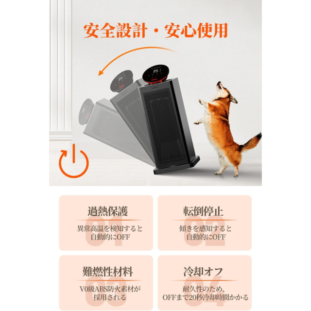 1.転倒保護装置:稼働中に倒したりすると自動的に電源オフ、火傷や火事になる恐れもなくなります。