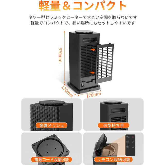 【清潔保持可能・片手でも移動出来!】吸い込み口のフィルターが取り外し出来、清掃可能で熱交換器の埃対策も万全!本足元ヒーターは17x17x37cmのコンパクトサイズで脱衣所、トイレ、洗面所など大型ヒーターの入らない狭めの場所にも置いてご利用いただけます。ヒーターの裏面にハンドル付き、2.20kgで片手でも移動出来て収納もしやすくなります。1.5mの電源コード付き、ニーズにお応えする場所を気軽に選ばなく、どこに置いても楽々です!