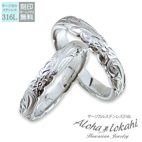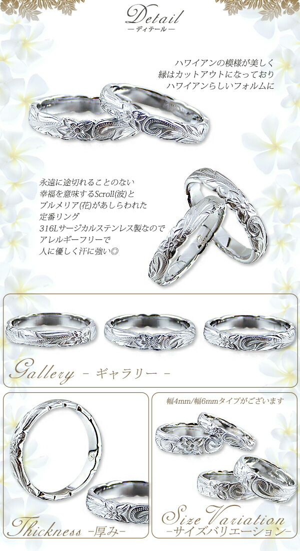 ハワイアンジュエリー ペアリング 刻印無料 指輪 ステンレス サージカルステンレス バレル カットアウト スクロール プルメリア シルバーカラー メンズ レディース ハワイアン カップル 2個セット クリスマス プレゼント