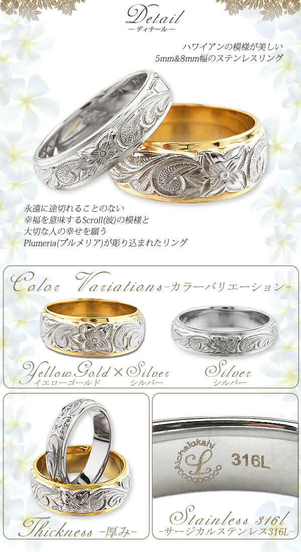 | 商品名 | ハワイアンジュエリー ハワイアン ペアリング 刻印無料 指輪 リング ステンレス サージカルステンレス ダブル カットアウト ストレートエッジ スクロール プルメリア |