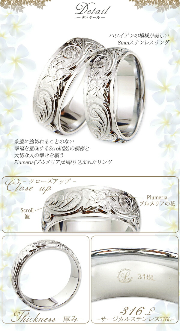 | 商品名 | ハワイアンジュエリー ハワイアン ペアリング 刻印無料 指輪 リング ステンレス サージカルステンレス ダブル カットアウト ストレートエッジ スクロール プルメリア |