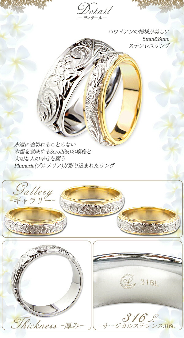 | 商品名 | ハワイアンジュエリー ハワイアン ペアリング 刻印無料 指輪 リング ステンレス サージカルステンレス ダブル カットアウト ストレートエッジ スクロール プルメリア |