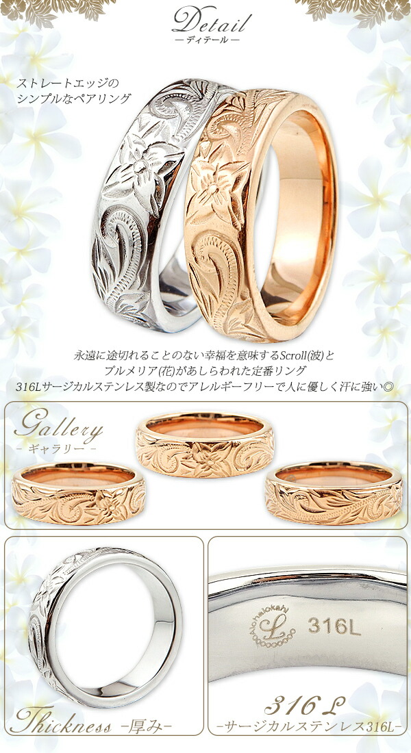 ハワイアンジュエリー ペアリング 刻印無料 指輪 ステンレス サージカルステンレス スクロール プルメリア ローズゴールド ピンク シルバーカラー メンズ レディース バレル ストレートエッジ 6mm ハワイアン カップル 2個セット クリスマス プレゼント