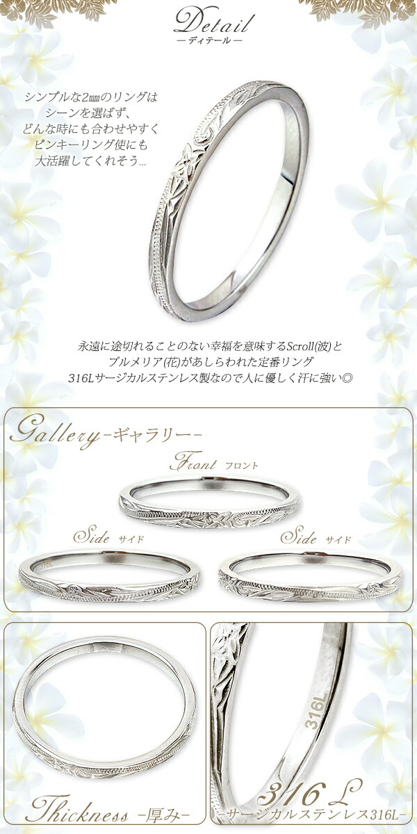| 商品名 | ハワイアンジュエリー ハワイアン ペアリング 刻印無料 指輪 ステンレスハワイアンジュエリー サージカルステンレス ピンキーリング スクロール プルメリア |