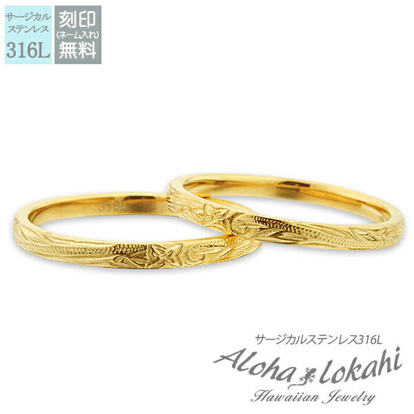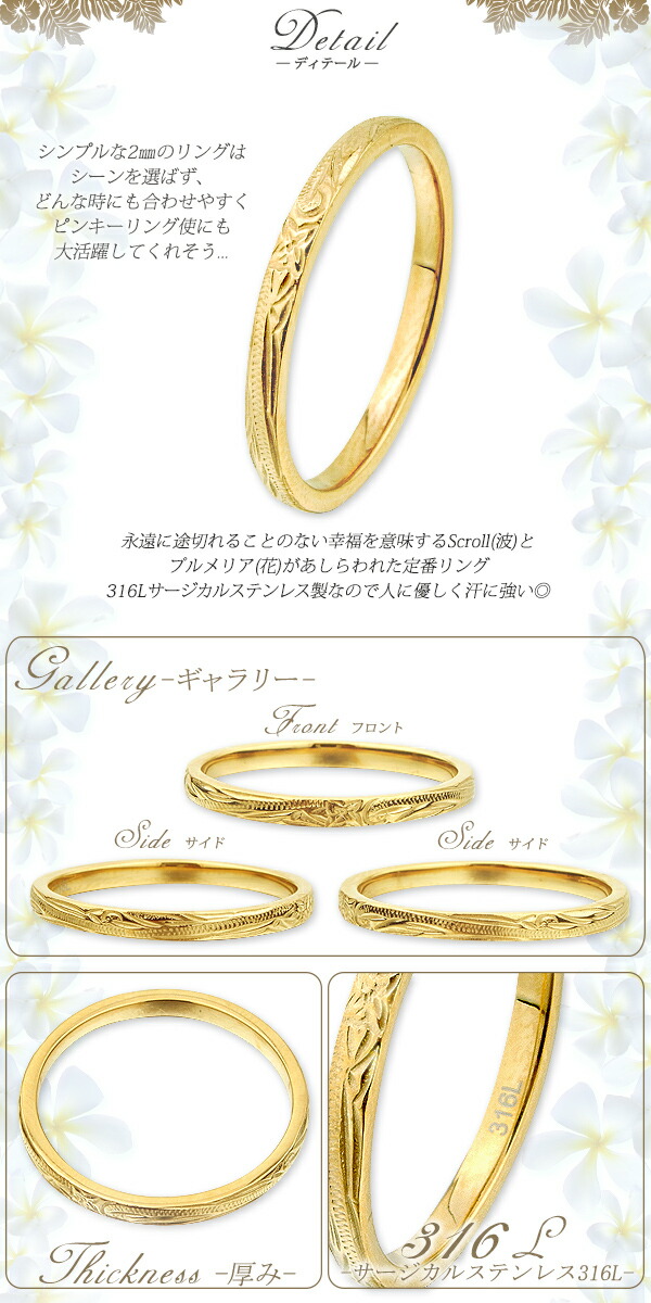 ハワイアンジュエリー ペアリング 刻印無料 指輪 ステンレスハワイアンジュエリー サージカルステンレス ピンキーリング スクロール プルメリア イエローゴールド メンズ レディース 幅2mm ハワイアン カップル 2個セット クリスマス プレゼント