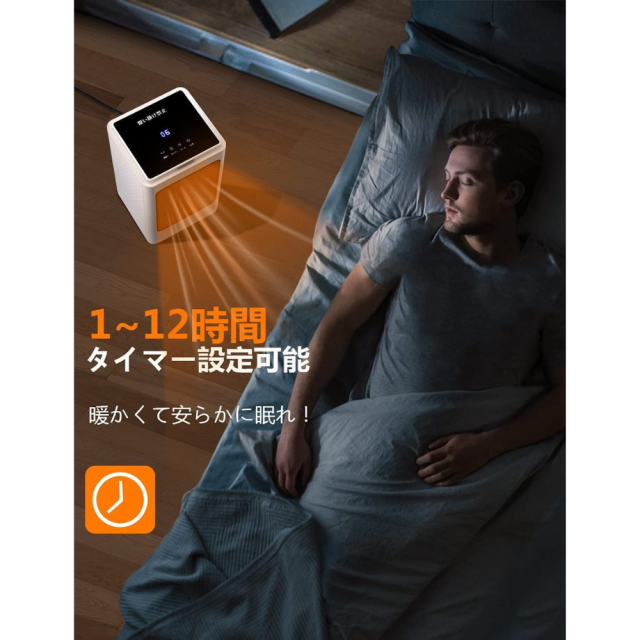 【リモコン操作、1〜12時間タイミング機能】本ヒーター 小型の全ての操作は、デジタルディスプレイに触れるか、遠くから付属のリモコンでリモート操作することができます。この機能は、ベッドに横になって起き上がりたくないときや、足の横に置いても、腰をかがめたくないに最適です。また、1〜12時間の間は1時間単位でタイマー設定ができます。就寝時はタイミング機能が働き、もっとぐっすり眠ることができます。