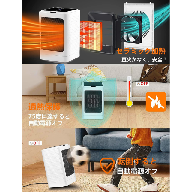 2.転倒自動オフ。足元 暖房は倒れたと、電源は自動にオフになります。