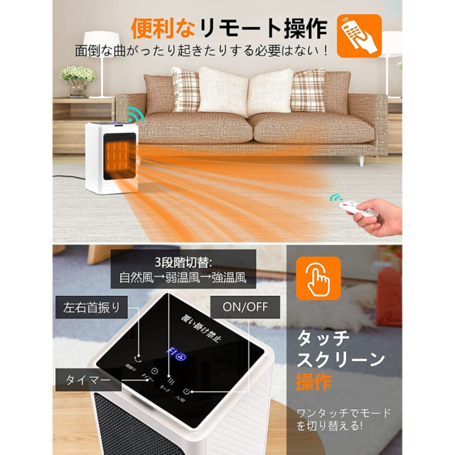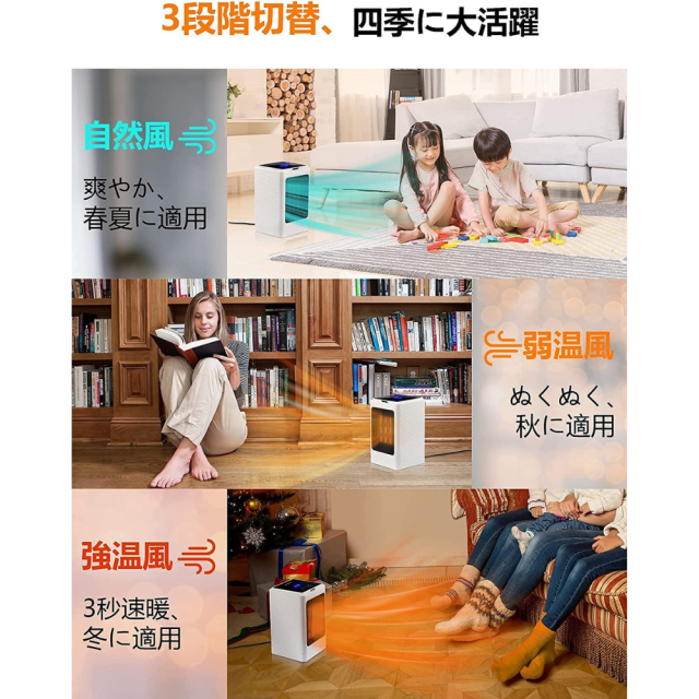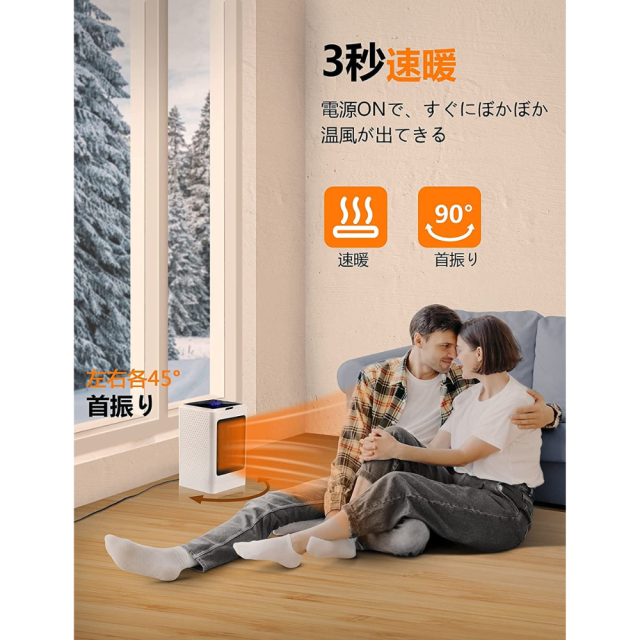 【3秒速暖、省エネ、小型】本電気ヒーターの発熱体はPTCセラミックを採用して、電熱転換率は高いです。スイッチONで、すぐ熱が出ます!暖かな風が待たずに吹くので、朝の準備や帰宅直後に最適です。また、電気式なので、ガスやオイルなどの燃料を使用しません。省エネとは一方で環境にも優しいです。環境にも財布にも優しい小型セラミックヒーターです。