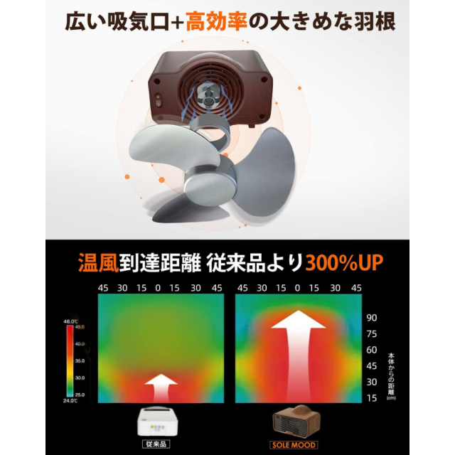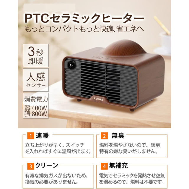【コンパクト・使用便利】起動後わずか3秒で温風を供給してくれるSOLEMODE。 「小さいから、パワーも弱いんじゃない?」 そんな心配は無用です。 広い吸気口から取り込まれた空気は、電気の力で熱を持ったセラミックによって暖められ、内蔵の巨大なファンにより室内に送られます。最大温風到達距離は、1mで、とってもハイパワーです。
