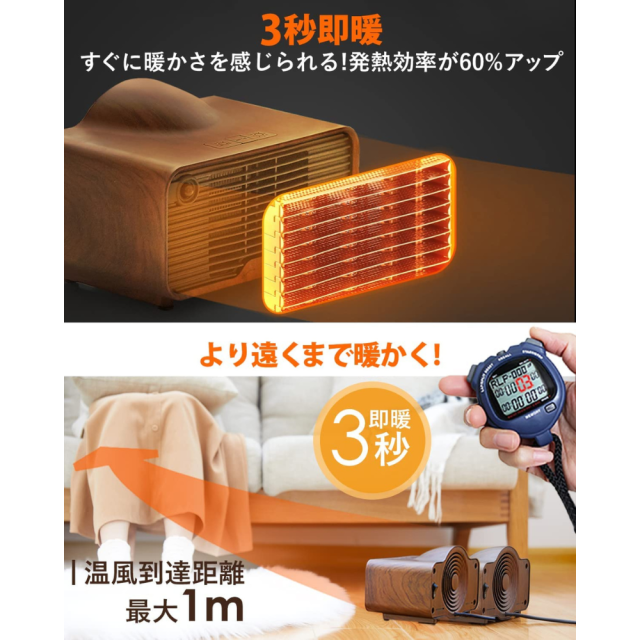 【3秒速暖・省エネ】PTCセラミック発熱材料を採用し、電熱転換率が高く、電源を入れると、待ち時間なしで温風が出ます。950W出力で1時間当たり/約20円、400W出力で1時間当たり/約10円。部屋・体が十分温まったら、低温風に切り替えて、電気の無駄がなく、省エネ。環境にも財布にも優しいセラミックヒーターです。