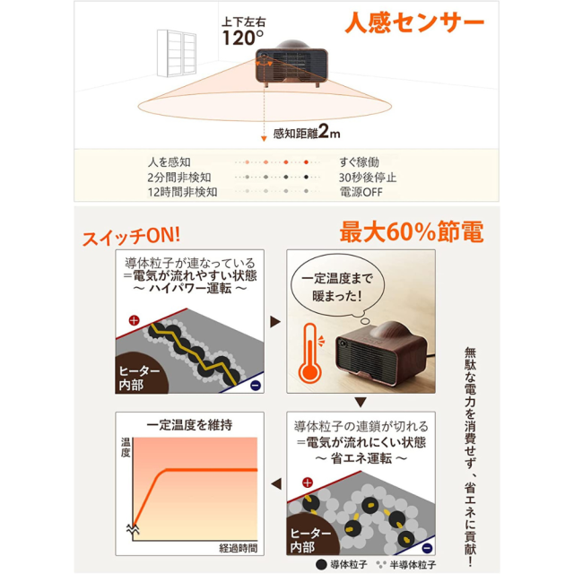【人感センサー・2段階切替・静音運転】煩わしいON・OFF操作不要の人感センサー付き。 運転停止時、人を感知すると素早く稼働します。2分間非検知状態が続くと、送風を行い、30秒後に自動停止します。さらに12時間非検知状態が続くと、自動で電源がオフになる安心機能付き。無駄なく、暖めることが可能です。ご注意:同じ場所で一定的な時間で加熱すると、人感センサーが同じく人間だと検知して、作業続くしてしまう場合もございますので、予めご了承ください。なお、人感センサーモード以外には2つのモードもあります、強弱2つのモードでお好きな暖かさをお選びいただけます。しっかり暖めたいときは800wのハイパワーで。ほんのり暖めたい時は400wの省エネ運転がおすすめです。稼働音は、弱モード時44db/強モード時49dbです。