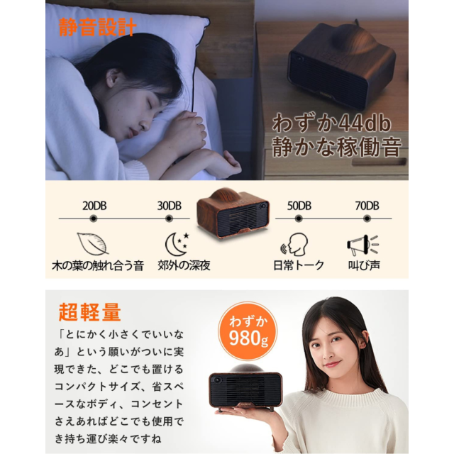 【ハイパワー・静か】稼働音は、弱モード時44db/強モード時49dbです。 一般的に、40dbは図書館の中、50dbは静かな事務所の中程度の騒音とされています。ハイパワーなのに、とても静か。作業に集中したい時や、就寝時にお使い頂く際も、稼働音が妨げになることが有りません。