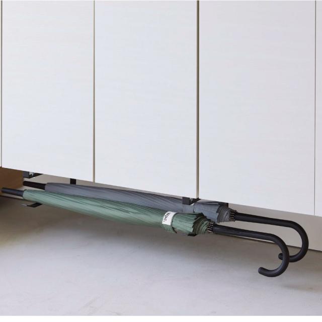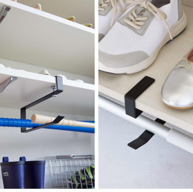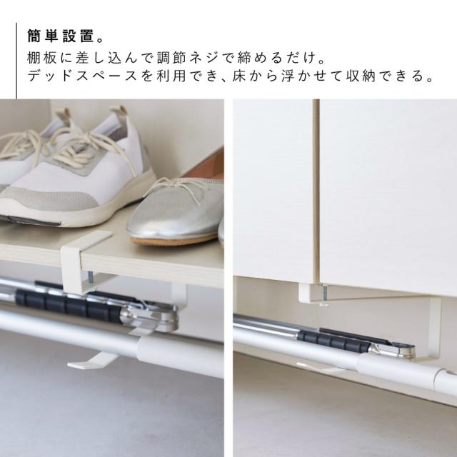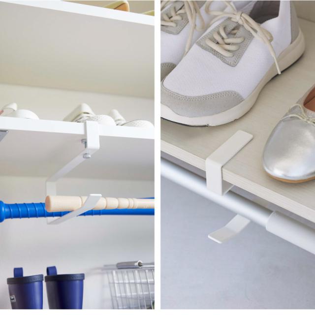 下駄箱に差し込むだけ!置き場所に困る長物の掃除道具を浮かせて収納できるハンガー2個組。下駄箱下の棚板に差し込んで調節ネジで締めるだけの簡単設置。デッドスペースを有効利用でき、床から浮かせて収納できるので、気軽にお掃除もできます。