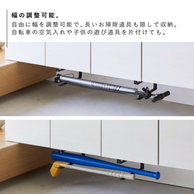 自由に幅を調整できるので、ほうきやトングなどの長いお掃除道具も隠して収納できます。自転車用のフロアポンプの収納にも便利。