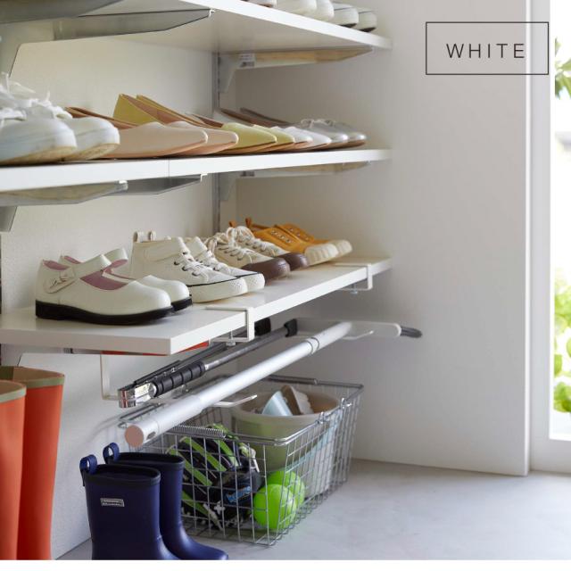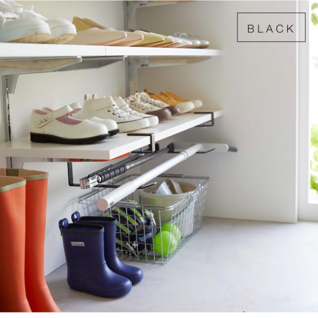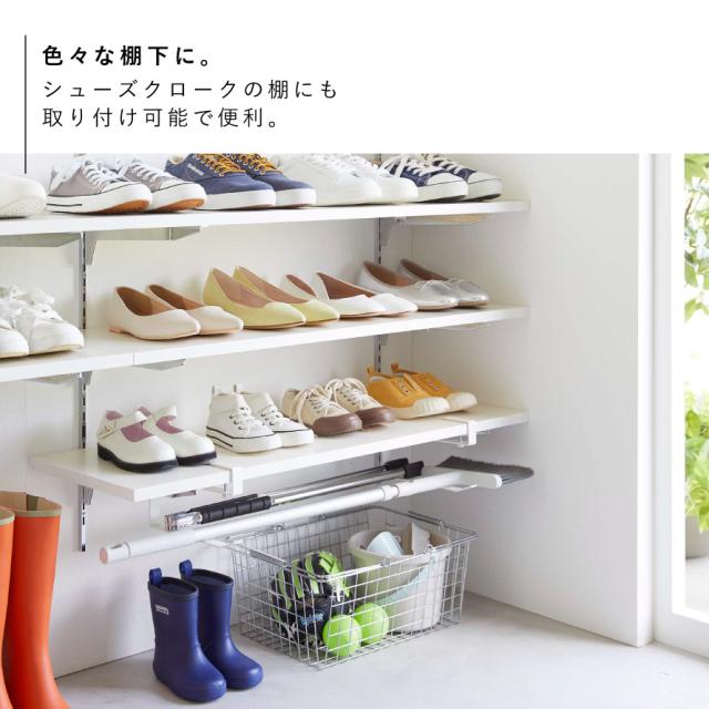 シューズクロークの棚にも取り付け可能。置き場所に困る子供用のスポーツ道具や遊び道具などの収納にも便利。