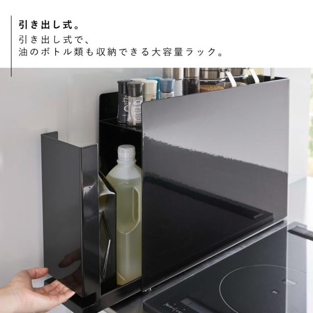 引き出し式で、油のボトル類も収納できる大容量の調味料ラック。上部はオープンで使いやすく、小さいスパイス類や調味料ストッカーなどを収納可能です。(別売の「調味料ストッカー タワー」も収納可能。)